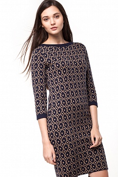 Платье плотной вязки "жаккард" с геометрическим узором прилегающего силуэта классической длины чуть выше колена и рукавом 3/4. Горловина и манжеты выполнены из той же однотонной пряжи