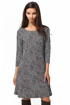 Платье выполнено из плотного очень эластичного джерси с принтом под твид. Плотное прилегание по фигуре в верхней части и свободное расклешение от линии талии. Рукава 3\4. Рукава до локтя. В больших размерах длина до колена.