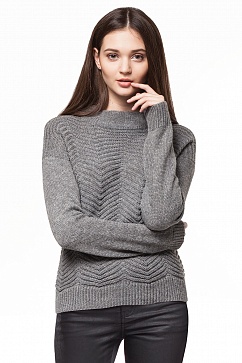 Уютный джемпер средней вязки из пряжи с высоким содержанием шерсти, и плотно прилегающим воротом. Перед и спинка имеют фактурную вязку в крупную "елочку", низ и манжеты вывязаны "резинкой".