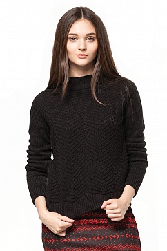 Уютный джемпер средней вязки из пряжи с высоким содержанием шерсти, и плотно прилегающим воротом. Перед и спинка имеют фактурную вязку в крупную "елочку", низ и манжеты вывязаны "резинкой".