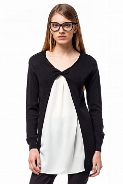 Удлиненный жакет тонкой вязки. Спереди состоит из двух слоев - нижний слой из полуматовой атласной ткани с небольшой сборкой по горловине. Верхний вязаный слой жакета спереди украшен декоративным перекрученным узлом.