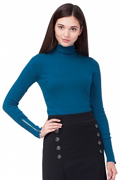 Свитер вязаный из хлопковой пряжи с добавлением нейлона для придания формоустойчивости. Высокий ворот носится с отворотом. Классическая форма , с плотным облеганием по телу. Важным трендовым элементом являются золотистые молнии на рукавах.
