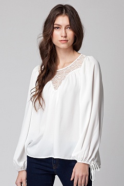 Блуза женская из плотного искусственного крепового шелка свободного покроя. Верх блузки спереди и сзади выполнен в виде фигурной кокетки из кружева, окантованного тканью по горловине. Низ рукава широкий, но собирается в сборку по руке на тонкую завязку.