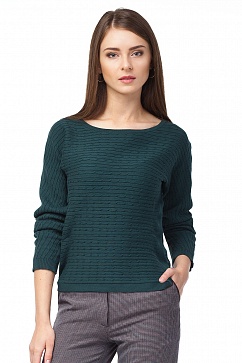 Укороченный джемпер фактурной вязки из хлопковой пряжи с добавлением нейлона для мягкости и износостойкости. Изделие свободного силуэта с цельнокроеной проймой "летучая мышь" и облегающими рукавами. Эффектно украшают силуэт отдельно вывязанные боковые детали и низ изделия.