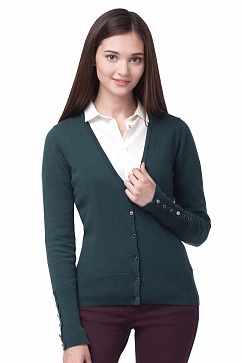 Жакет из хлопковой пряжи с добавлением нейлона для придания формоустойчивости изделию. Глубокий v-образный вырез, планка на эффектных пуговицах с эмалью в тон изделия. Широкая резинка по низу изделия и на манжетах.