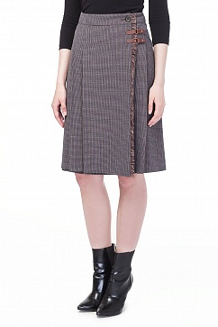 Юбка актуальной длины "миди" с запахом с крупными складками по бокам, выполнена из мягкой и эластичной классической ткани в мелкую трехцветную "лапку". Передний кант декорированы бахромой. В левой части две регулируемые застёжки из искусственной кожи.