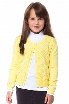 Жакет из мягкой хлопковой пряжи. Перед выполнен ажурной вязкой. Застежка на пуговицы.
