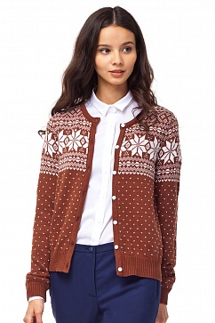 Жакет из легкой и теплой пряжи с небольшим количеством шерсти, вязка средней плотности, застежка на пуговицы. Верхнюю часть жакета украшает контрастная вязка снежинки.