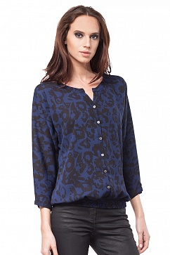 Блузка выполнена из плотного синтетического шелка с эффектным сине-черным принтом под леопарда. Перламутровые пуговки спереди и на манжетах, рукава 3/4. По низу блузка собрана на несколько эластичных строчек-резинок.