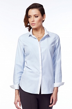 Блузка рубашечного покроя с отложным вопротником на стойке, выполнена из плотной фактурной ткани, воротник и планка контрастного цвета. В верхней части планки под воротником и на манжетах золотичные пуговицы.