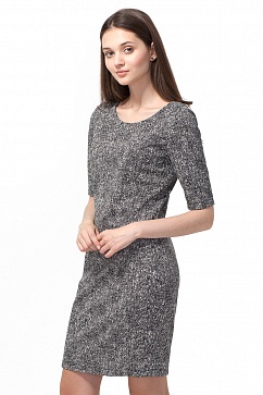 Платье выполнено из плотного очень эластичного джерси с принтом под твид. Плотное прилегание по фигуре. Эффектный вырез на спине, застежка на металлическую молнию т. серебристого цвета. Рукава до локтя. В больших размерах длина до колена.