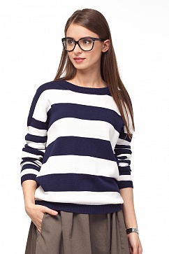 Джемпер изготовлен из хлопковой пряжи вязкой средней плотности. Полосы разной ширины: на полочке и спинке одной ширины, на рукавах - другой. Широкая окантовка горловины связана резинкой , по низу рукавов и изделия так же вязка резинка. Трендовый силуэт спущенной проймы подчеркивает эффектность широких полос.