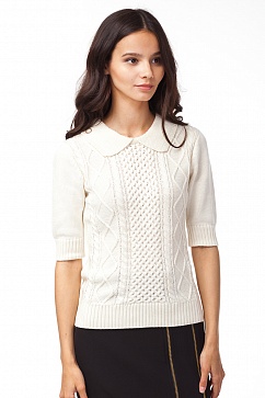 Джемпер изготовлен из мягкой и теплой смесовой пряжи с добавлением хлопка. Горловина с отложным вязаным воротничком, который придает джемперу женственный вид.
