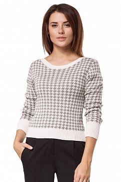 Джемпер плотной двухцветной вязки из хлопка. По плечам и горловине проходит широкий однотонный лампас. Горловина, манжеты и низ связаны вязкой резинка из однотонной пряжи.