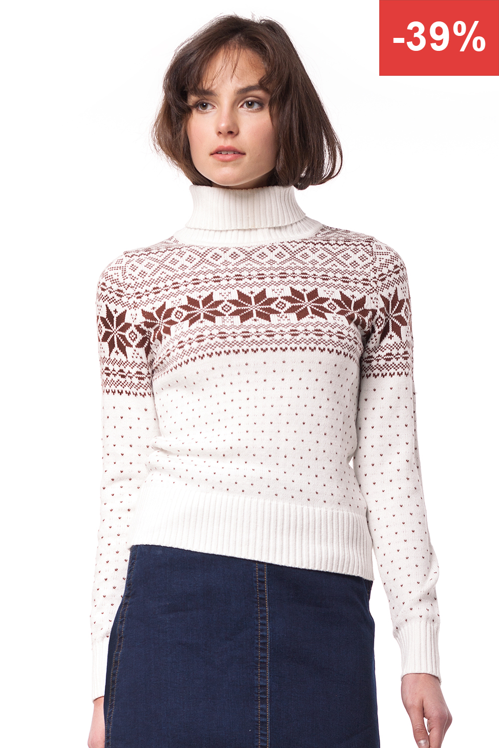 Свитер из мягкой и теплой хлопковой пряжи с добавлением акрила, который обеспечивает яркость красок, вязка средней плотности. Верхнюю часть свитера украшает контрастная вязка снежинки.