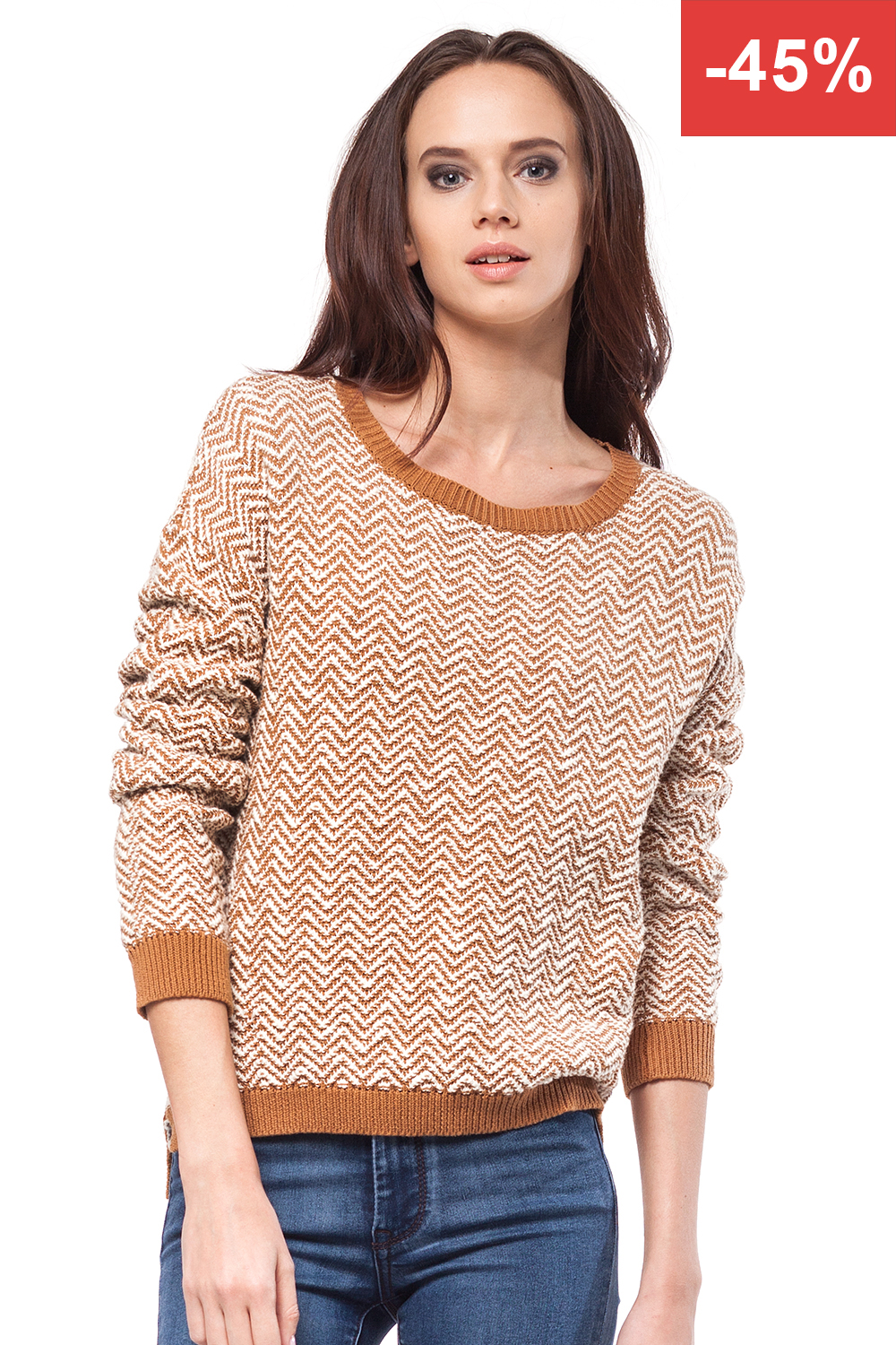 Джемпер свободного силуэта с длинным рукавом , контрастным воротом и манжетами. Модель выполнена с применением факутрной вязки " в ёлочку".