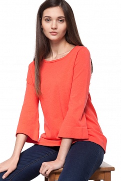 Джемпер выполнен из хлопковой пряжи с небольшим количеством нейлона для придания формоустойчивости и драпируемости изделию. Круглый двойной ворот, рукава и низ имеют широкую подгибку. Низ рукавов расширен.