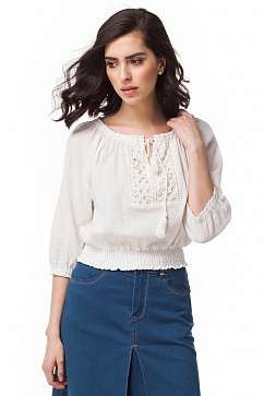 Блузка из тонкой фактурной ткани с лёгким эффектом крэш - марлёвки. Спереди, по обе стороны от разреза горловины нашито широкое кружево. Горловина собрана на резинку, разрез спереди фиксируется хлопковым крученым шнурком с кисточками на концах. По низу блузки простроченный эластичными нитями пояс. Низ рукава на резинке.