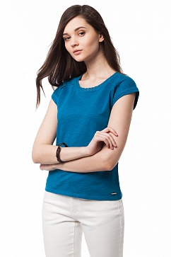 Футболка женская из трикотажного фактурного хлопкового полотна с декоративными швами на плечах, которые, как и горловина, украшены хлопковым кружевом в тон футболки. Спущенное плечо, объемный верх хорошо сочетается с узким низом. Внизу пришит маленький золотистый логотип.
