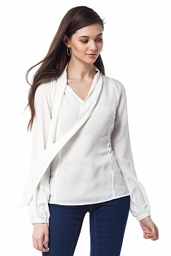 Блузка выполнена из креповой полу вискозной ткани. Горловина обработана воротником-шарфом, который может завязываться спереди бантом, или на узел. Рукава втачные, широкие, с защипами у плеч, внизу собираются на узкую манжету.