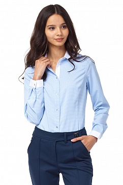 Блузка рубашечного кроя выполнена из плотной вискозной ткани. Отложной воротник на стойке и манжеты выполнены из отделочной ткани. Планка и манжеты на пуговицах.