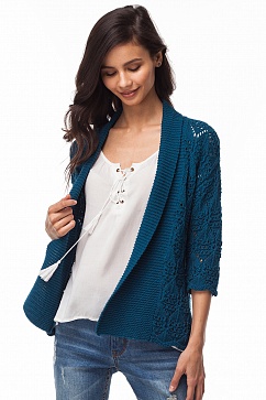 Жакет связан ажурной вязкой из хлопковой пряжи. Рукава 3/4. Спереди широкие планки переходящие в отложной воротник-шаль.