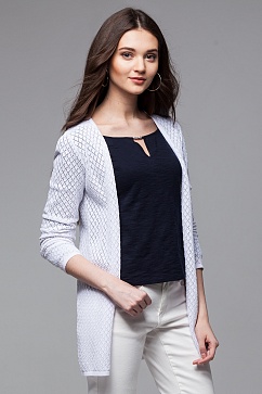 Жакет вязаный из хлопковой пряжи. Ажурная вязка ромбами. По горловине, борту, низу и рукаву тонкая двойная прикетлеванная вязаная обтачка.
