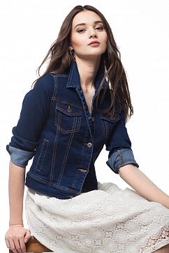 Джинсовый жакет классического покроя. На груди карманы с клапанами, на талии - прорезные с листочкой. Декоративные контрастные строчки выполнены толстыми нитками. Минимальная стирка с отсутствием потери цвета - актуальное исполнение в стиле 70-х.