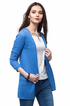 Жакет вязаный из хлопковой пряжи. Ажурная вязка ромбами. По горловине, борту, низу и рукаву тонкая двойная прикетлеванная вязаная обтачка.