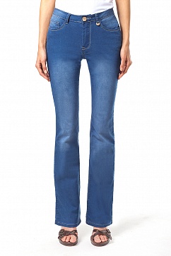 Джинсы-клеш. Выполнены из очень эластичного денима. Заниженная талия, плотная посадка по верхней части ноги, клеш от колена.
