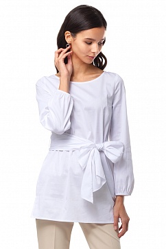 Удлиненная блуза-туника изготовлена из тонкого хлопчатобумажного полотна с добавлением полиэстера для меньшей сминаемости. Широкий длинный пояс завязывается объемным бантом на талии. Укороченный рукав снизу собран на резинку.
