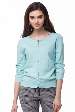 Жакет из хлопковой пряжи с добавлением нейлона для придания формоустойчивости изделию. Выполнен декоративной вязкой в "крапинку" выпуклой формы. Широкая резинка по низу и рукавам. Пуговицы полукруглые на ножке золотистого цвета. Рукава 3/4