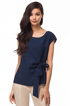Блуза без рукавов из плотного мягкого полу-вискозного полотна с эффектом жатости. Широкие ленты на поясе завязываются с боку на декоративный бант.