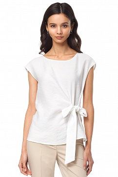 Блуза без рукавов из плотного мягкого полу-вискозного полотна с эффектом жатости. Широкие ленты на поясе завязываются с боку на декоративный бант.