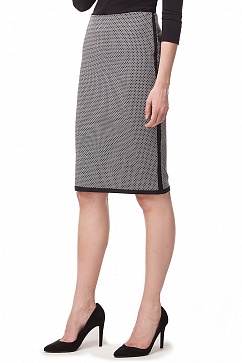 Юбка-карандаш изготовлена из мягкой и очень эластичной костюмной ткани на эластичной подкладке. Лампасы и отделочная полоса по низу выполнены из контрастной ткани. Изделие классической длины "миди" закрывает колено и заужается книзу. Застежка сзади на потайную молнию.