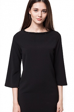 Платье-футляр из пластичного крепового полотна. Эффектный расклешенный рукав 3/4. Линия горловины украшена декоративной лентой с нашитыми на нее черными бусинами. В больших размерах длина платья до середины колена.