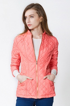 Куртка изготовлена из плотной плащевки, выполненной из нитей двух оттенков для придания фактурного матового мерцания, легкого эффекта "хамелеон". Куртка простегана с утеплителем двойной строчкой в виде ромбов. Воротник стойка, застежка на золотистую молнию. Спереди наклонные карманы с рамками на молнии. Из передних рельефов назад отходят в обе стороны хлястики, позволяющие регулировать ширину куртки по талии. Борт внутри украшен бежевым кантом.