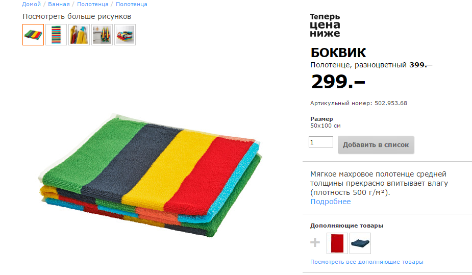 Мягкое махровое полотенце средней толщины прекрасно впитывает влагу (плотность 500 г/м²).
