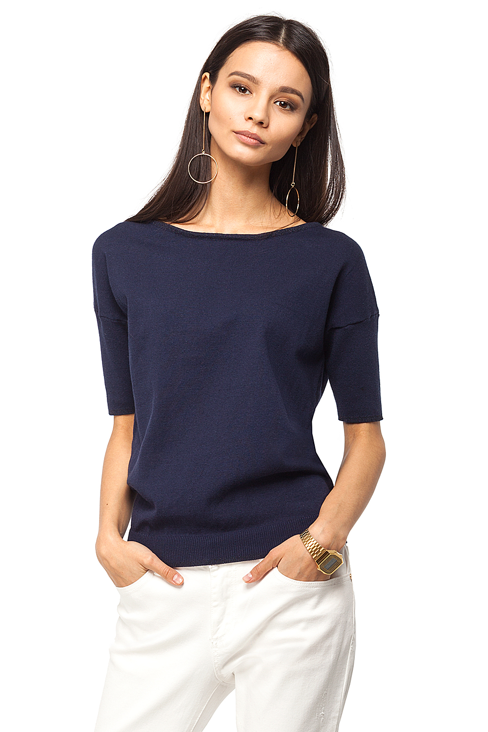 Джемпер свободного силуэта со спущенным плечом связан из эластичного хлопковой пряжи. Укороченный рукав и низ изделия вязан резинкой. На спине декоративный вырез-капля. Низ изделия и рукавов, горловина и плечевой шов вязаны с добавлением в пряжу тонкой люрексной нити