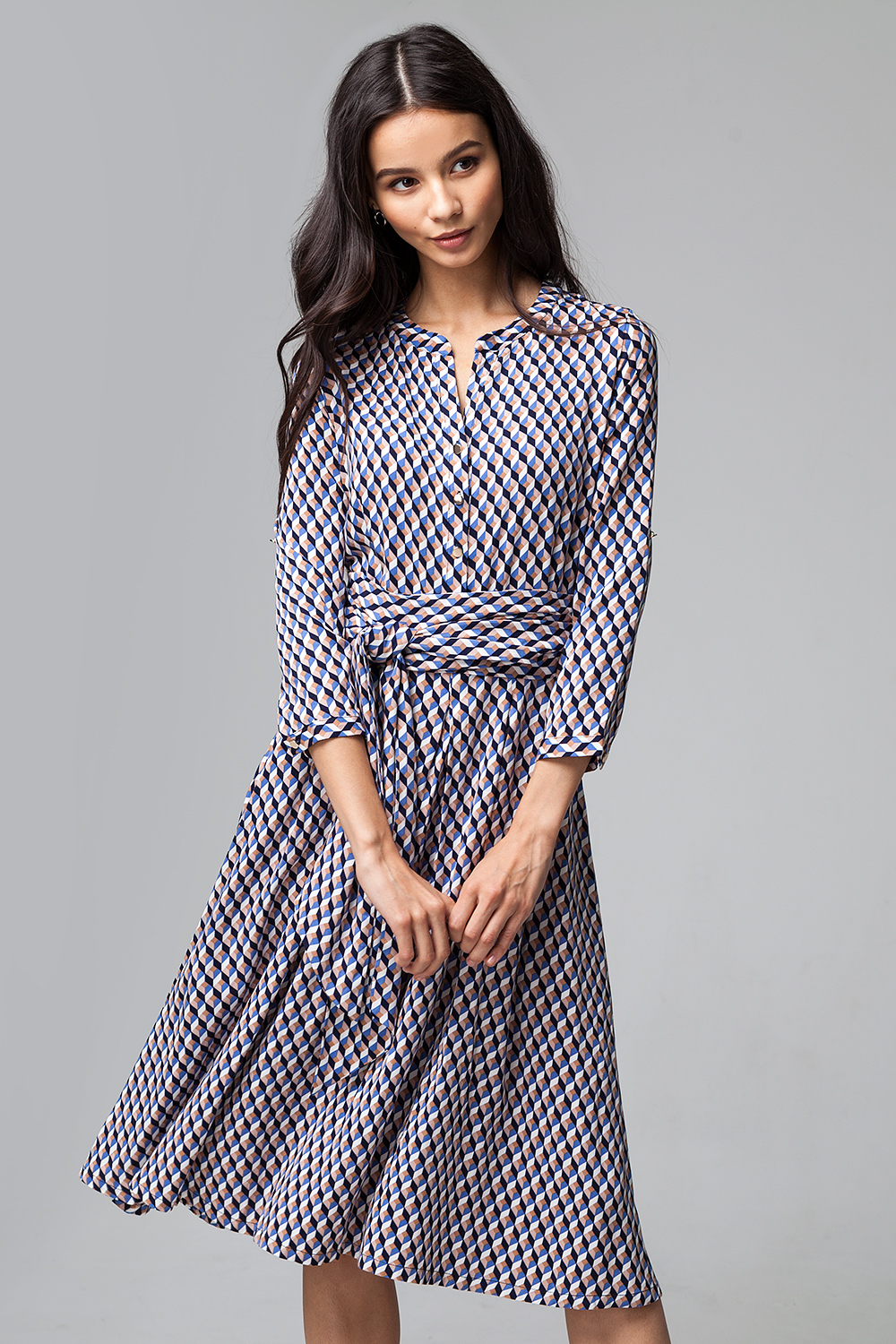 Платье-миди из штапельной вискозы с ярким геометрическим принтом. Отрезное по линии талии с пышной юбкой с глубокими складками. В комплекте широкий пояс из основной ткани, который зрительно подчеркивает талию. Рукав 3/4, длина регулируется патой с застежкой на пуговицу. Круглый вырез горловины с V-вырезом и застежка на планку на пуговицах до талии.