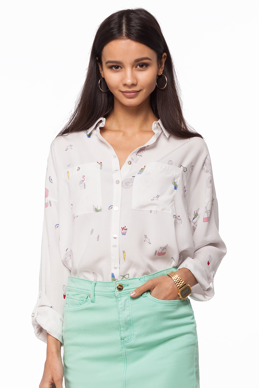 Блузка свободного силуэта со спущенным плечом изготовлена из тонкого вискозного полотна с оригинальным молодежным принтом. Классический отложной воротник, застежка на планку на пуговицах. Накладные карманы. Удлиненная спинка с широкой двойной кокеткой.