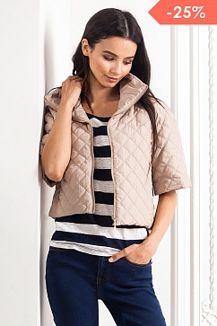 Куртка выполнена из плотной плащевки, выполненной из нитей двух оттенков для придания фактурного матового мерцания, легкого эффекта "хамелеон". Простегана с утеплителем двойной строчкой ромбами . Куртка на подкладке. Спереди застежка на золотистую молнию, которая продолжается на воротнике-стойке. Особенностью данного изделия является - короткие рукава - выше локтя и широкой стойкой воротника. Новая форма - трендовый силуэт.