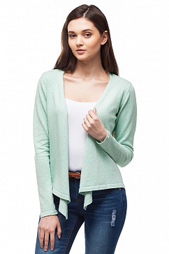 Приталенный жакет с драпированной планкой и асимметричной линией низа. Изделие связано из эластичного хлопковой пряжи. На манжете декоративная металлическая нашивка с логотипом.