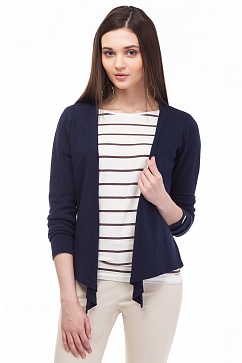 Приталенный жакет с драпированной планкой и асимметричной линией низа. Изделие связано из эластичного хлопковой пряжи. На манжете декоративная металлическая нашивка с логотипом.