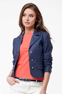 Жакет женский из льняной ткани, обработанной специальной пропиткой , которая придает ткани глянцевый эффект и предотвращает сильную сминаемость. Классический покрой, спереди рельефы, карманы с клапаном. На рукаве шлица с четырьмя отделочными пуговицами. Жакет без подкладки, основные припуски швов внутри окантованы атласной лентой бежево-золотого цвета. Подплечники из поролона скрыты широкой обтачкой и подбортом. По лацкану и воротнику отделочная строчка в цвет ткани.