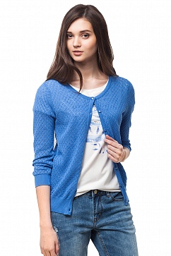 Кардиган из хлопковой пряжи выполнен ажурной вязкой ромбами. Низ изделия и манжеты вязаны широкой резинкой. Рукава 3/4, застежка на пуговицы в тон изделия.