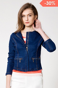 Укороченный джинсовый жакет из эластичного полотна. Округлый вырез горловины, застежка на планку на молнии. Внутренняя часть кокетки спинки выполнена из тонкого хлопка с декоративным узором. Спереди горизонтальные карманы с застежкой молнию.