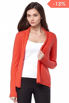 Жакет изготовлен из хлопковой пряжи с небольшим добавлением нейлона для придания мягкости. Широкие борта, отворачиваются в виде воротника-шаль. Удлиненная ассиметричная спинка с декоративным швом с припусками наружу.