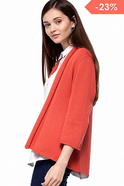 Жакет свободного силуэта из хлопковой пряжи с добавлением акрила, который придает изделию мягкость и пластичность. Рукава 3\4 с расклешением к низу. Спереди отделочная широкая планка, переходящая в отложной воротник.