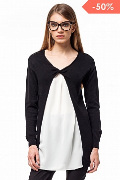 Удлиненный жакет тонкой вязки. Спереди состоит из двух слоев - нижний слой из полуматовой атласной ткани с небольшой сборкой по горловине. Верхний вязаный слой жакета спереди украшен декоративным перекрученным узлом.